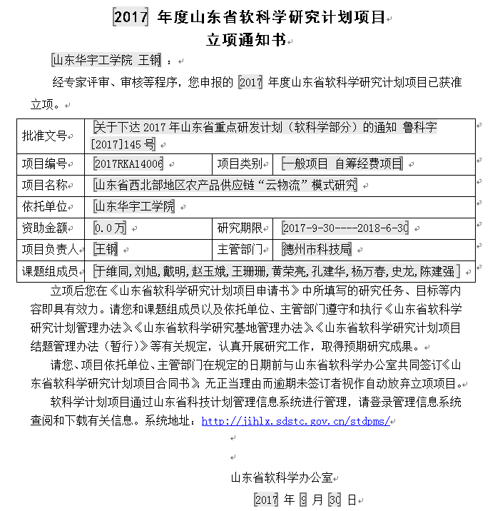 今日,山东省科学技术厅下发了《关于下达2017年山东省重点研发计划(软科学)部分的通知》(鲁教字[2017]145号),我院王钢老师的《山东省西北地区农产品供应链“云物流”模式研究》(项目编号2017RKA14006)获批立项,这也是我校2017年度获批的唯一一项软科学项目,同时也填补了我院山东省重点研发计划的空白。