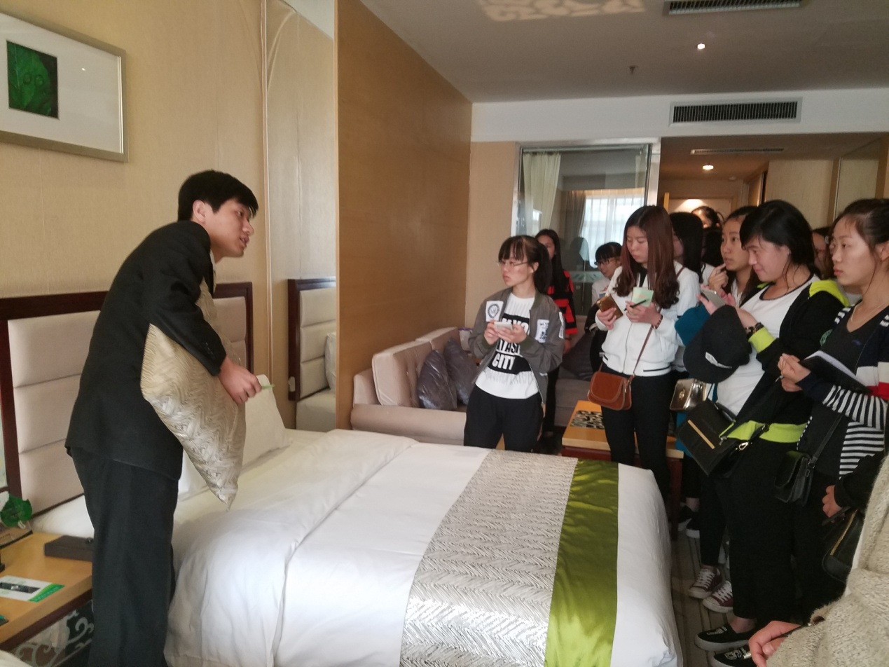 在客房部,为学生们介绍了客房部组织结构、岗位职责、服务流程,并参观了标准间和总统套房,进一步详细讲解了客房的设施设备、客房服务的要点等知识,使学生在观摩过程中更好的理解了书本的理论知识。在康乐部,带领学生们参观了健身房、游泳池、高尔夫球场等,使学生对于康乐服务的重要性有了进一步的认识。