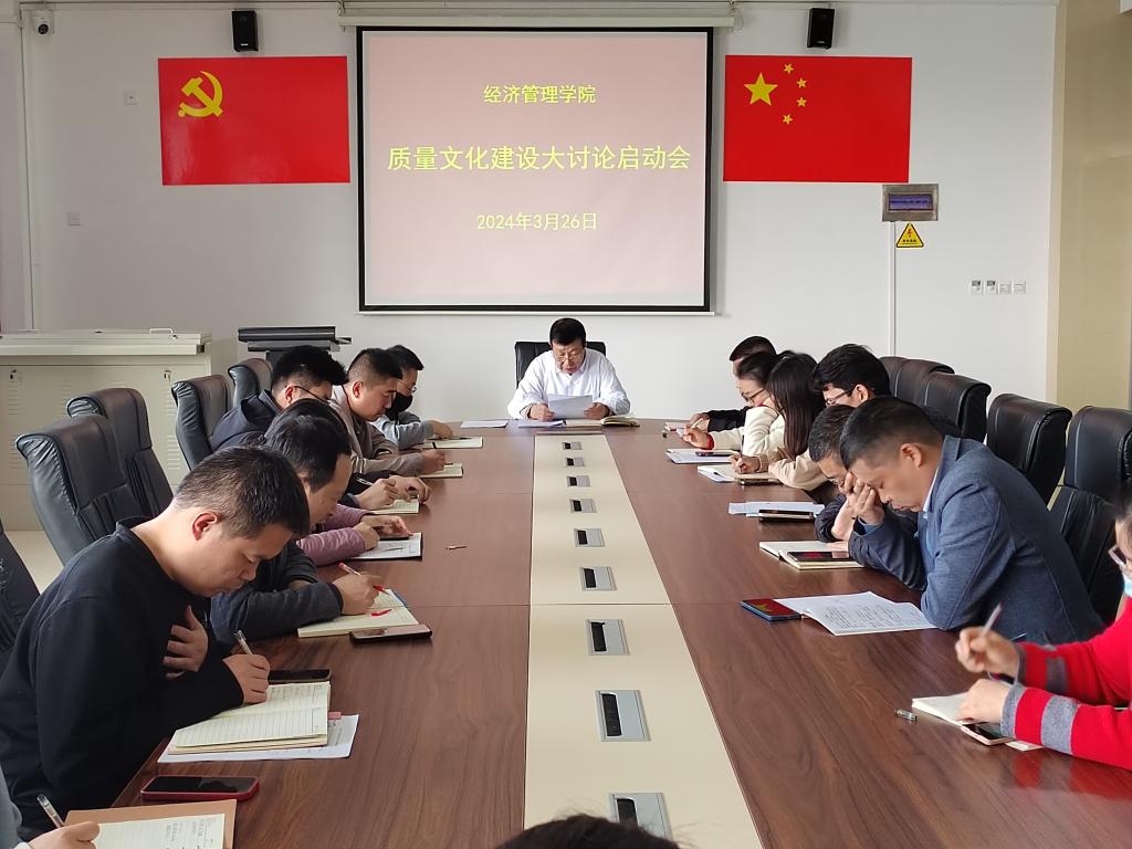 质量文化是持续提升学校教育教学质量最持久的内在动力。落实 《教育部关于加快建设高水平本科教育 全面提高人才培养能力的意见》文件精神与《yl7703永利集团关于开展质量文化建设大讨论的通知》要求,yl7703永利集团于3月26日召开了开展质量文化建设大讨论启动会议,会议由院长于维同主持,学院科级及以上人员参会。