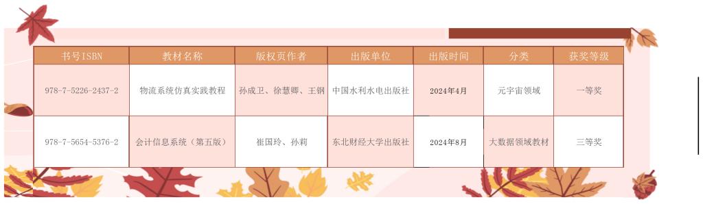 8月20日,全国高校人工智能与大数据创新联盟优秀教材评审委员会公布了2025年度全国高校人工智能+数字经济优秀教材评选拟获奖名单,我院孙成卫、徐慧卿、王钢老师主编的《物流系统仿真实践教程》以及崔国玲、孙莉老师主编的《会计信息系统》(第五版)分别获一等奖与三等奖。