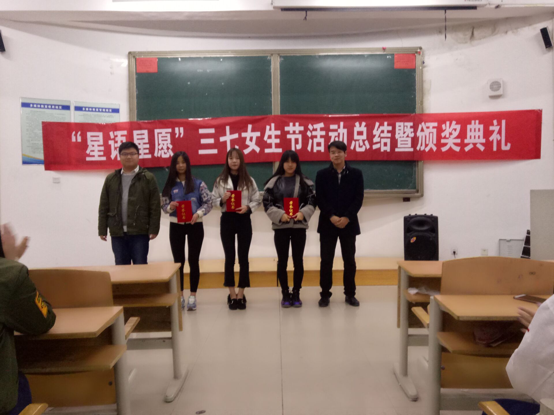 随后,王敏老师为在许愿墙活动中获评的“最佳绅士”奖的赵鹏程、孙高强颁发了证书,裴虎城老师、杨增凯老师为“我心目中的女神”的前三名颁发了证书。