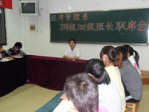 2010年5月6日下午7:30,经济管理系在8#205顺利举行了班长联席会。本次活动由经济管理系张开涛主任主持,08、09级各班班长参加。