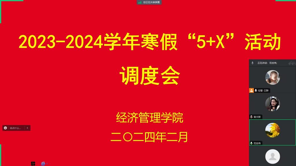 为了扎实推进我院寒假“5+X”活动的有序开展,全面掌握寒假期间各班级“5+X”活动的开展情况,我院于2月19日上午召开了2023-2024学年寒假“5+X”活动开展情况调度会。本次会议由团总支书记王群主持,党总支书记、副院长范世伟、学管科长王敏以及全体辅导员参加了此次会议。