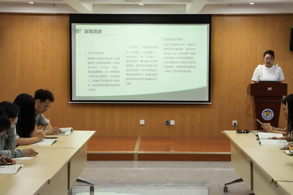 活动中,柴健老师结合《高校思想政治工作质量提升工程实施纲要》等政策文件,系统梳理服务育人从政策溯源到实践落地的发展脉络,深入解读“围绕学生、关照学生、服务学生”的核心要求。她提出,服务育人要在日常事务管理中实现价值引领与能力培养的有机统一,既注重解决学生实际问题,更要强化思想引领。针对“00后”学生群体特征及当前辅导员服务育人工作存在的问题,柴老师从精准把握需求、创新服务载体、提升专业能力等方面提出具体破局策略。随后邵楚涵、杨泽、于晓月三位老师分别结合工作实际,分享了在学生事务管理、心理健康教育、学业指导等领域的服务育人经验,深入剖析当前工作面临的挑战与应对思路,引发与会人员的共鸣与思考。