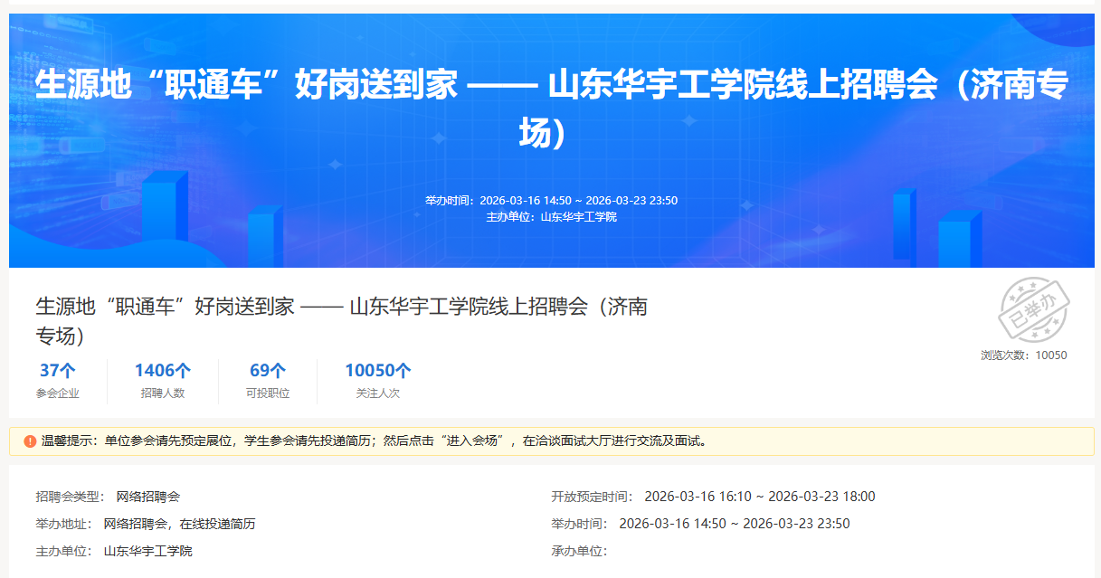为扎实推进2026届毕业生就业工作,精准搭建校企供需对接桥梁,全力护航毕业生高质量充分就业,我院联合济南市人力资源和社会保障局等相关单位,于2026年3月16日至23日,成功举办生源地“职通车・好岗送到家”济南专场线上招聘会,切实为济南籍毕业生返乡就业铺路搭桥。