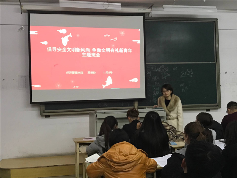 我院辅导员针对每个班级、每个学生,共开展了43场主题班会。18级辅导员老师以校园文明为重点,倡导学生“校园不吸烟、垃圾不乱扔、车辆不乱停、餐食不浪费、言行不失仪”;17级辅导员从学生优秀行为习惯养成的角度出发,鼓励学生做到“言谈举止文明有礼、公共场所文明有礼、师生相处文明有礼、行路骑车文明有礼、就餐购物文明有礼”;16级辅导员从学校规章制度出发,引导学生遵守校纪校规,安全文明离校。