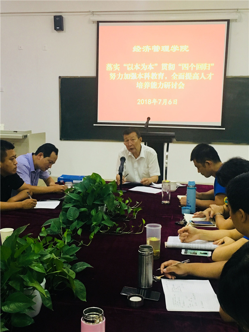 2018年6月21日,教育部召开了新时代全国高等学校本科教育工作会议,会上陈宝生部长在会议上作了题为《坚持以本为本推进四个回归 建设中国特色、世界水平的一流本科教育》的讲话。我院科级以上管理干部收看了电视直播会议。教育部会议结束后,学校执行校长梁玉国就贯彻落实会议精神发表了“切实贯彻好会议精神,牢牢把握高校的四大任务”的几点意见。为切实落实“以本为本”贯彻“四个回归”的教育理念,我院于近日在科学实验楼712室召开落实“以本为本”,贯彻“四个回归”,努力加强本科教育,全面提高我院人才培养能力研讨会。学院科级以上管理干部参加了研讨,会议由院长于维同主持。