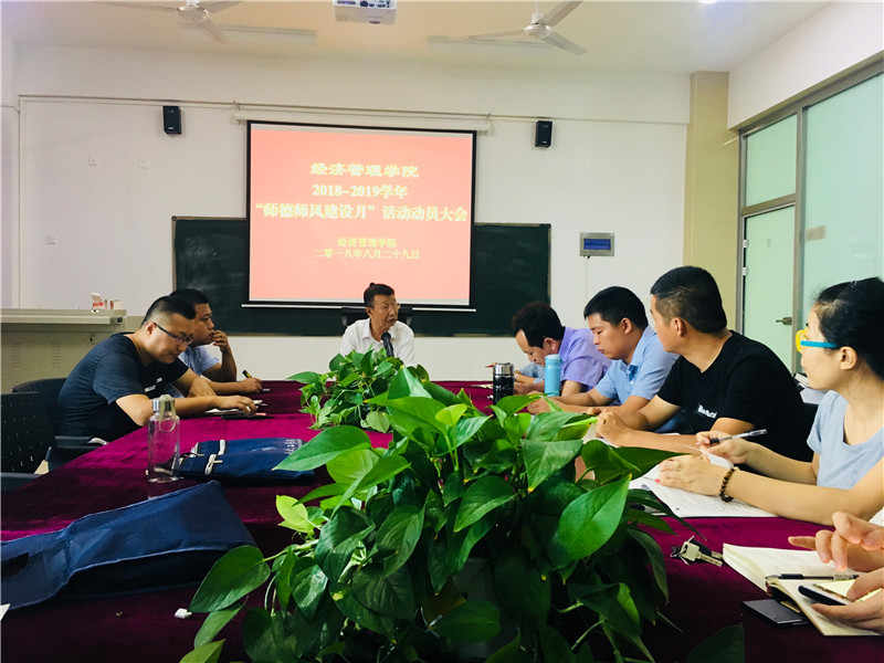 为落实学校鲁华宇院校办字〔2018〕30 号文件精神,提高教师队伍整体素质,引导我院教师做有理想信念、有道德情操、有扎实学识、有仁爱之心的党和人民满意的好老师,大力加强师德建设,努力造就一支师德高尚、业务精湛、结构合理、充满活力的高素质专业化教师队伍,我院自8-9月份开展“师德师风建设月”活动。8月29日上午,“师德师风建设月”活动动员大会在20号楼712召开,院长于维同主持会议,经管学院全体教师参加了会议。