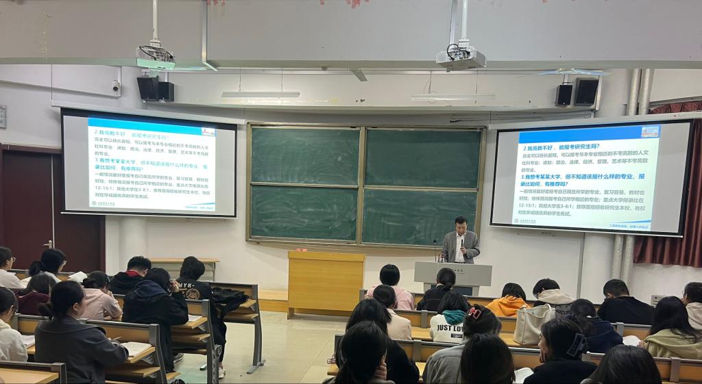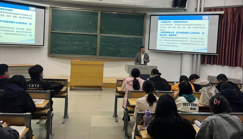 大会伊始,于院长结合当前严峻的就业形势分析了考研的必要性。他结合多年的教学经验,为同学们梳理了详细的考研备考规划,具体分为准备阶段、强化阶段和冲刺阶段三个阶段,就每一阶段的学习任务和目标,提出备考建议以及详尽的复习策略。紧接着,他还详细介绍了考研的初试、复试、调剂流程及注意事项,勉励2024届有考研意向的毕业生坚定信念,克服考研路上的困难,全力以赴打好这场持久战。最后,我院辅导员于晓月老师结合2023届毕业生考研成功上岸的备考经验,从课程复习进度把握、心理调适方法等方面进行了分享,鼓励大家要以良好的心态和科学的学习方法来面对考研,学会调整学习状态。