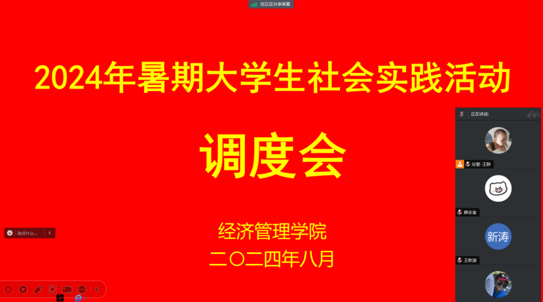 为深入掌握我院暑期大学生社会实践活动的开展情况,详细了解实践活动过程中存在的困难和问题,扎实推进我院社会实践工作顺利进行,8月6日上午,我院通过腾讯会议的形式线上组织召开了2024年暑期大学生社会实践活动开展情况调度会。本次会议由团总支书记王群主持,党总支书记、副院长范世伟以及各团队社会实践指导教师参加了此次会议。